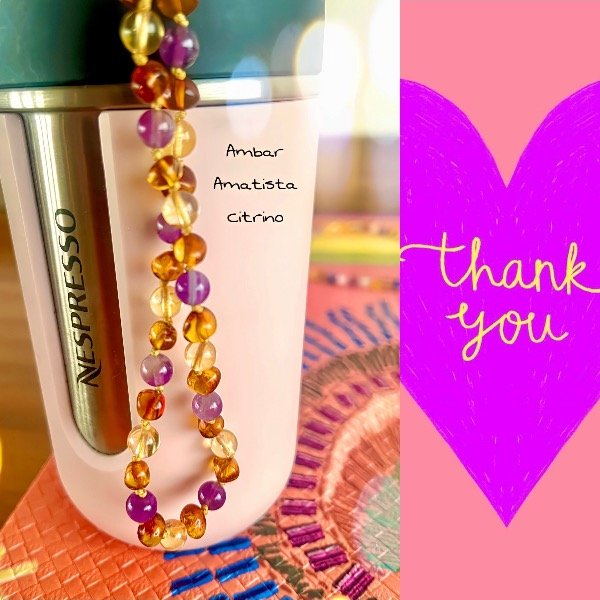 Collar artesanal. Collar de ambar cogñac con piedra amatista y piedra citrino. Cierre hipoalergénico a rosca. Medida: 38cm.