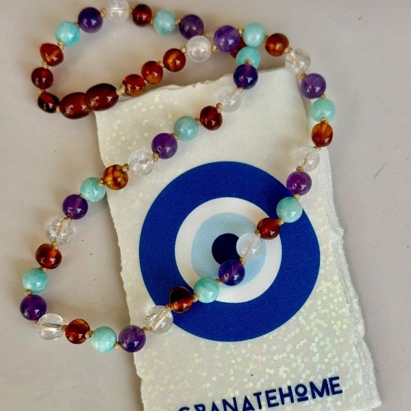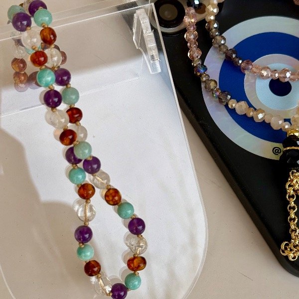 ambar color cogñac y piedras naturales: cuarzo cristal, amatista, Amazonita