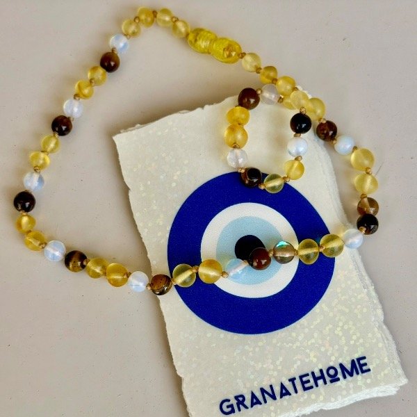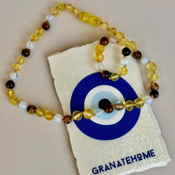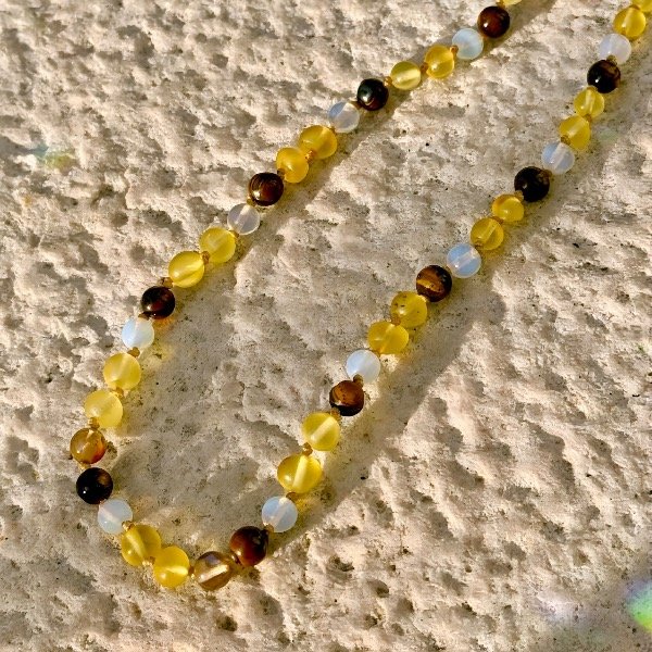 ambar lemon sin pulsar y piedras naturales: ojo de tigre, opalina