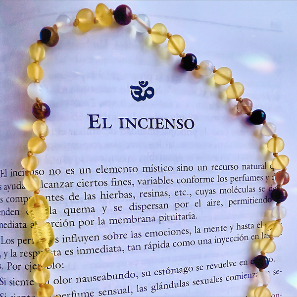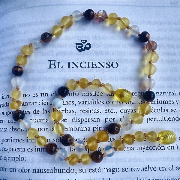 Collar artesanal de ámbar original sin pulir y piedras naturales. Medida 38cm. Cierre a rosca hipoalergénico.