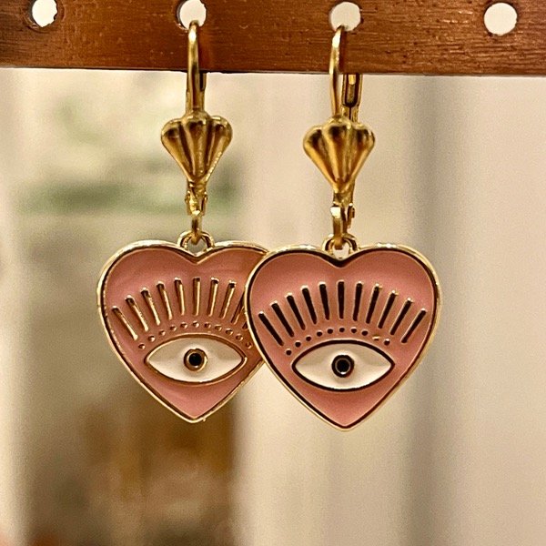 Aros colgantes con brisura italiana y dijes de corazón esmaltado en el frente color rosa. Diseño con ojo. calidad GOLDFILLED @granatehome