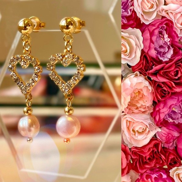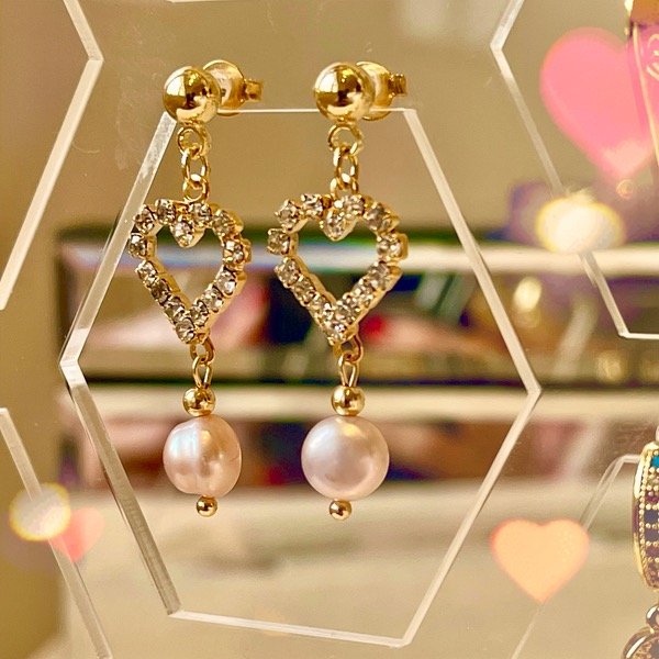 Aros colgantes con corazón de stras y perlas. Calidad GOLDFILLED
