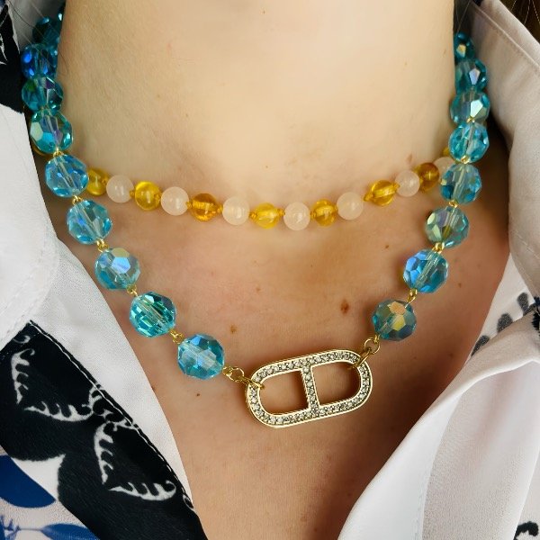 Collar con cristales de roca color turqueza. Cierre mosqueton. En el centro pieza especial con microcircones en el frente y costados. Calidad Goldfilled