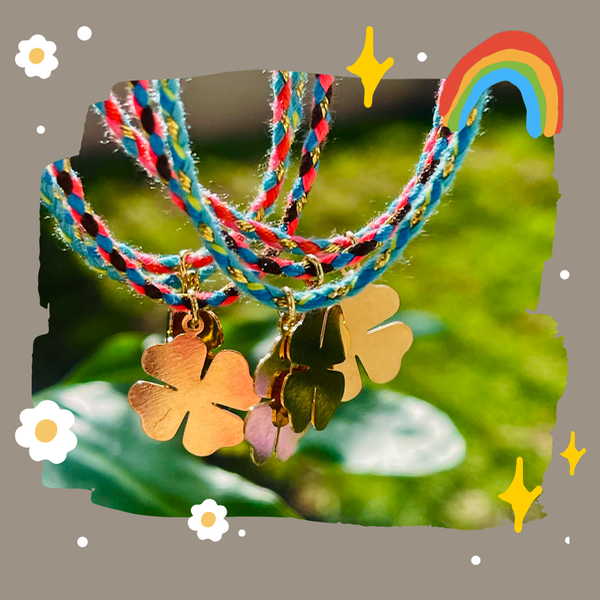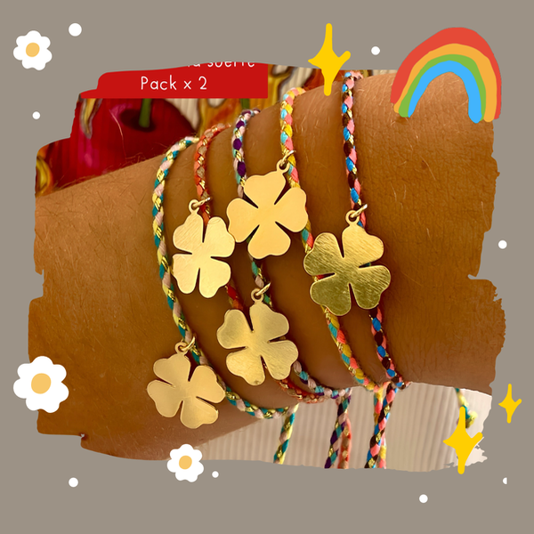 dos pulseras artesanales de hilo trenzado con medida regulable, con dije trébol cuatro hojas, dije calidad GOLDFILLED